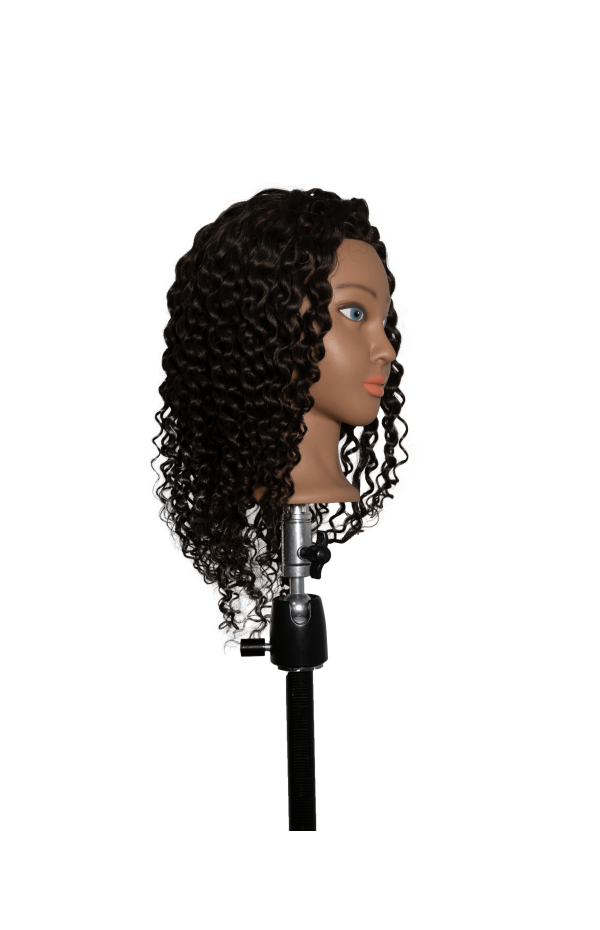 You can also perform balayage and bleaching exercises on the Alma professional styling head; the curly hair of this mannequin head is 100% natural, of Indian origin. We don’t recommend coloring this professional styling head, as its color is already dark enough (tone level 3), so you won’t get any visible results. Finally, you can perform straightening and Brazilian exercises on this textured, wavy hair styling head. All professional hairstyling equipment should be chosen specifically according to your needs: 100% natural hair styling heads, coloring heads, professional clipper cutting techniques on men’s mannequins, curly hair cutting training heads, Afro styling heads etc….